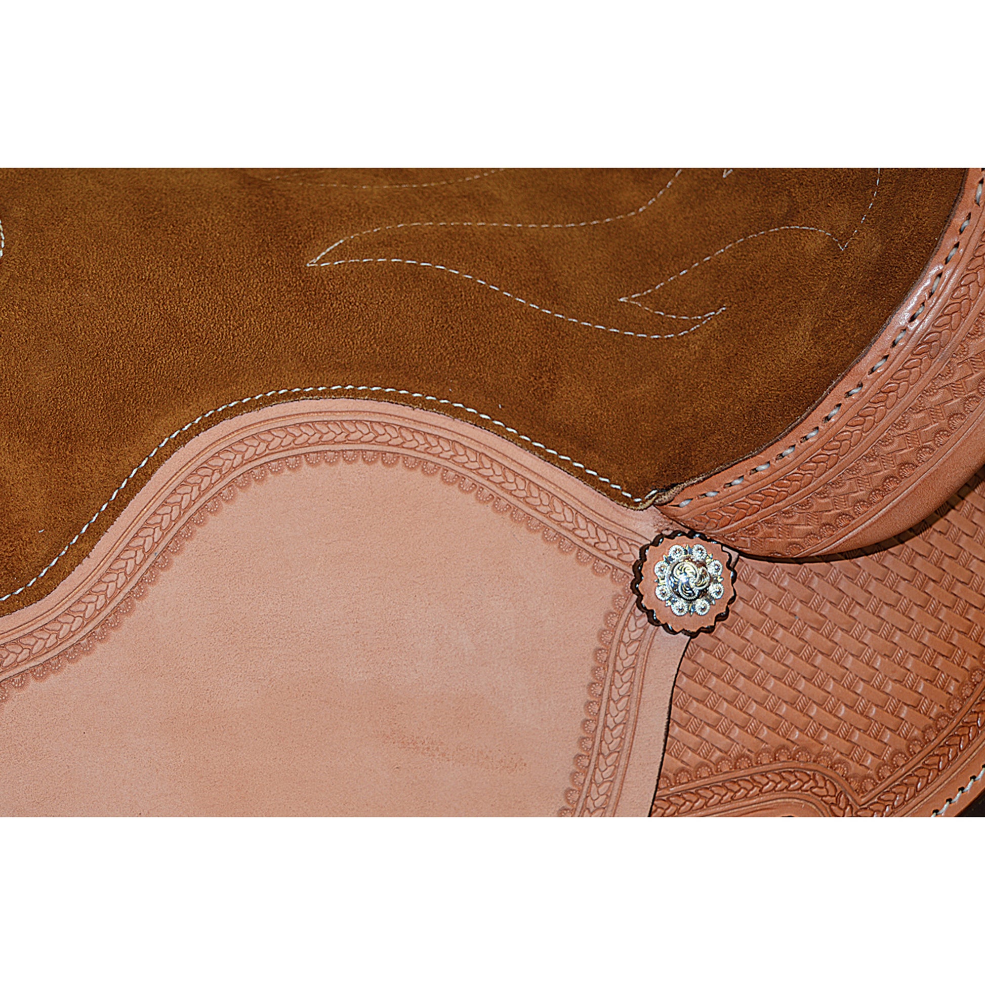 A lightweight SUPREME BARREL SADDLE continues with the design and construction we have been suppling the Equine industry for many years. Built with American Steer hides, Stainless Steel Dees, In-skirt riggings, Mother Hubbard style skirt, turned fenders, basket stamped and rope border tooling, hand stitched cantle, berry conchos and a host of other great features make this highly desirable for today’s discerning Barrel Racer. This saddle is available in Natural. The Rough-out stitched suede seat, polished leather edging, saddle strings, and close contoured skirts give this saddle a very good finished appearance.